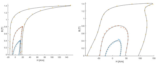The macro-scale simulation of the dynamic magnetization processes in soft ferromagnetic materials is still an interesting and promising field of research. Indeed, the optimum design of electrical machines and magnetic components, regardless of the particular area of application, requires an accurate description of the materials used [1,2]. More specifically, the response of the material to the external excitations, together with the geometry of the device, highly influences the final merit factors [2,3,4,5]. Device simulation is typically performed via commercial Computer-Aided Design (CAD) programs based on the Finite-Element Method (FEM), which is not able to account for the material characteristics thoroughly. For instance, hysteresis models embedded into FEM schemes are not yet available in commercial software, and the material is usually represented with a constant value of the magnetic permeability or, in the best cases, with a suitable non-linear anhysteretic function identified from the data provided by the manufacturer. It has to be specified that the FEM analysis carried out using a non-linear anhysteretic material model can only take the material saturation into account, but cannot provide important information related to the coercivity, the remanence, or the phase lag between the magnetic field H(t) and the magnetic induction B(t). In addition, since the curve on the B-H plane does not show any area, it is definitely impossible to predict the loss of energy.