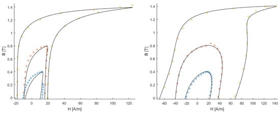 TEST 2: comparison between the simulated loops (colored cross markers) and the experimental ones (black continuous lines) with amplitudes of 0.4, 0.8, and 1.4 T, at a frequency of 20 Hz (left panel) and 400 Hz (right panel).