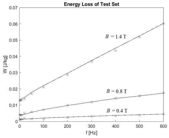 In the final step of our investigation, the prediction of the dynamic energy losses is discussed. It can be demonstrated that the area on the H-B plane enclosed by a hysteresis loop, having a given amplitude B and frequency f, represents the total energy dissipated in the process per unit of volume. It accounts for the hysteresis, and the classic and excess loss components, according to the separation principle. Here, the energy losses are calculated numerically for each measured and simulated loop, exploiting the trapezoidal approximation of the function B(H), and are plotted against the frequency for fixed values of the magnetic induction. Since the curves relative to the training set are easily reproduced by the neural network model, the prediction of the energy losses and the comparison with the experimental values are most interesting if performed on the test set. For this reason, Figure 5 shows the behavior of the experimental losses in the frequency interval of interest, together with the ones predicted by the model for B = 0.4 T, B = 0.8 T, and B = 1.4 T. To allow the visualization of the curves in the entire frequency range, the y axis is at a logarithmic scale. In Table 2, the results of Figure 5 are shown in numerical form.
