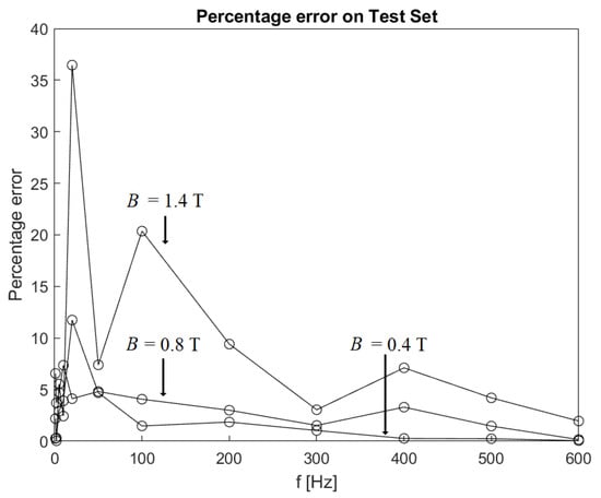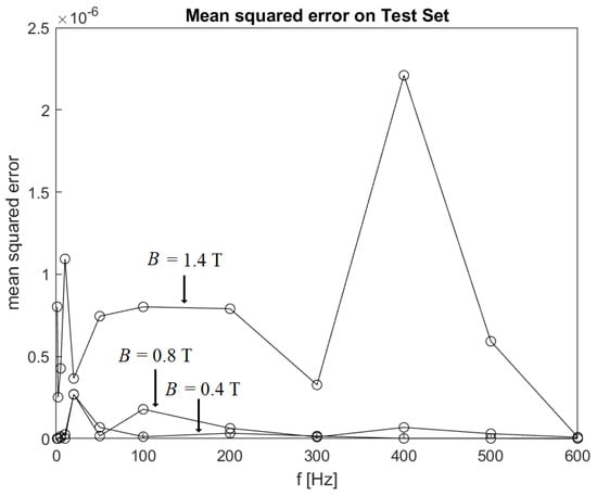 The curve traced with B = 0.4 T, after the overestimation of the energy loss for f = 20 Hz, shows a slight underestimation for f in the range of [50–300 Hz], but the absolute displacement is smaller than 3 J/kg. For any other value of B and f, the difference between the predicted values and the experimental ones is not appreciable and can be neglected. Figure 6 and Figure 7 show the percentage error and mean-squared error, respectively, related to the energy loss (Figure 5) on the test set.