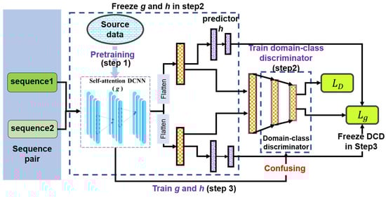 where P denotes sets of all data pairs, Q denotes the number of pairs, denotes the label of and D denotes the domain-class discriminator function. ϕ denotes a symbolic function that connects the features extracted from the sequence feature extraction network for two samples in a sample pair. The output of ϕ is further fed into the domain class discriminator for pair type determination.