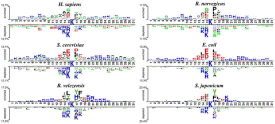 The amino acid frequencies of different species of H. sapiens, R. norvegicus, S. cerevisiae, E. coli, B. velezensis and S. japonicum dataset. Only residues significantly enriched or depleted (t-test, p < 0.05) flanking the centered acetylation sites (upstream 15 residues and downstream 15 residues) are shown.