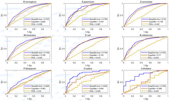ROC curves on R. norvegicus, S. japonicum, S. cerevisiae, M. musculus, E. coil, R. norvegicus, B. velezensis, F. palciparum, O. sativa and A. nidulans with different methods. The blue lines represent DeepDA-Ace, the red and orange lines represent CapsNet and PAIL, respectively.