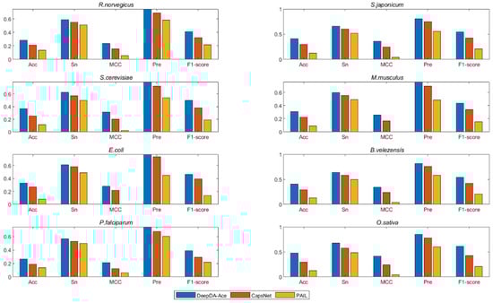 Additionally, we also calculate indicators including F1 score, Sn, Acc and Pre to evaluate different methods, and the results are listed in Table A2. Correspondingly, we also draw a histogram (Figure 4) to show the performance intuitively. Clearly, DeepDA-Ace achieves higher indicators than other tools on most species. For example, at the high stringency level, the performance of DeepDA-Ace is increased by 2.8% for Acc, 3.3% for Sn, 2.3% for Pre and 4.3% for F1 score, compared with CapsNet on B. velezensis. Additionally, on the E. coli dataset, the indicators of Acc, Sn, Pre and F1 score are also improved 3.2%, 6.5%, 6.7%, and 9.2%, respectively. In addition, DeepDA-Ace also achieves the best performance at a medium-stringency level. Taking B. velezensis as an example, the F1 score, Pre, Acc, Sn values of DeepDA-Ace are increased 11.8%, 5.4%, 5.8% and 11.2% compared with CapsNet. Meanwhile, compared to PAIL, DeepDA-Ace also achieves 33.1%, 23.3%, 14.4% and 27.7% improvement. In conclusion, our proposed DeepDA-Ace is superior to the existing, well-known acetylation tools.