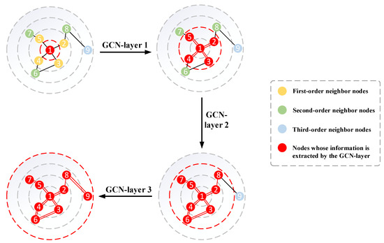 GCN is concerned with the information within the kth-order neighbors centered at a node in the graph. Single layer GCN can only extract the information of first-order neighbors. In order to extract information from a wider range of nodes in the graph, this can be achieved by stacking multiple layers of GCN, as shown in Figure 1.