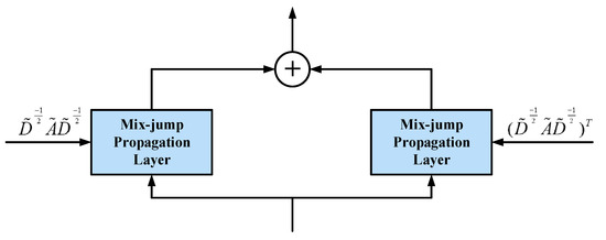 GCN can merge a node’s information with its neighbors’ information. For each node, in order to extract its multi-order neighbors’ information, it is necessary to stack multi-layer graph convolutional layers. However, as the number of graph convolution layers increases, the node hiding state gradually converges to a single point, which means that some information of the nodes’ original state will be lost [29]. Therefore, this paper proposes the mix-jump propagation layer to cope with information flow between graph nodes, which retains a part of the nodes’ original state during the propagation, so that the nodes’ state can maintain the locality and globality after propagation. The composition relationship between the graph convolution module and the mix-jump propagation layer is shown in Figure 2.