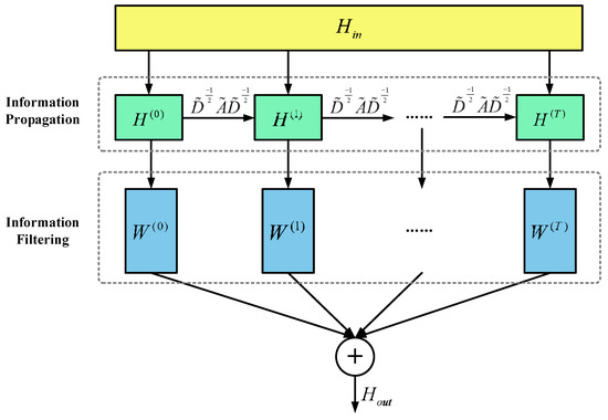 where α is the ratio of keeping the nodes’ original state, is the hidden states output by the preceding layer, . Typically, not all neighborhood information is valuable; the information filtering part is used to filter out the unimportant information generated at each jump. The information filtering part is defined as follows: