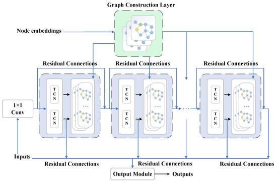 Existing GCN methods depend on manually predefined graphical structures to achieve time series prediction. However, in most cases, there is no explicit graphical structure for the multivariate time series, and the spatial dependence between multivariate time series must be discovered from the data rather than provided as basic facts. Even if the graphical structure is available, the manually predefined graphical structure may not be optimal and should be updated during training [30]. To address this problem, based on the findings of the literature [31], graphs can be trained from the backpropagation of the loss function using gradient descent, and this paper proposes a graph construction module. This module can model multivariate time series data, treat the variables in the multivariate time series as nodes in the graph, describe the relationships between the nodes using a graph adjacency matrix, and learn and update the internal graph structure simultaneously during the training process. The basic steps of the graph construction model are as follows:
