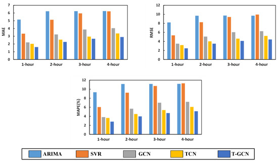 The performance of the T-GCN model and other methods in the multi-step-ahead electricity price forecasting task is shown in Table 1. It is not difficult to see that compared with other methods, the T-GCN model has achieved the best evaluation index in all forecasting tasks, which proves its effectiveness in multi-regional electricity price forecasting tasks. Figure 9 provides three histograms of MAE, RMSE, and MAPE values based on different models, which present more intuitively the performance differences between the different methods.