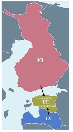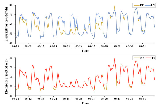 To better understand the contribution of the constructed graph adjacency matrix, Figure 11 shows the geographic location of the three price areas, LV, EE, and FI, where LV is the area geographically bordering EE, and FI is the constructed maximum weighted neighbor of EE. We plot the raw price data for these three regions in Figure 12.We observe that LV is closer to EE on the map, but the price data are less correlated. In contrast, the constructed maximum weighted neighbor FI is further away from EE, but their electricity price data are strongly correlated. Based on the flow data for the period, as shown in Figure 11, FI is the area that delivers the most power to EE, 5331.3 MWh more than LV, which shows that the T-GCN model can mine the potential dependence between variables through multivariate time-series data.