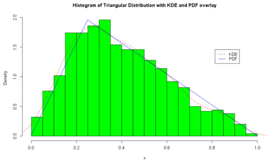 The ICDF transform method [41] is used to simulate random variables from the triangular distribution as illustrated in Figure 1. For clarity, we overlay a kernel density estimate and the PDF of the triangular distribution on the histogram of the random variables.