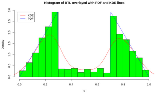 Using the ICDF, we can generate the random variates from the distribution which is illustrated in Figure 3. To showcase the exact shape of the BTL, we overlay the PDF of the generated variates as well as a KDE estimate. This is done to illustrate the exact bimodal distribution as well as the approximate bimodal distribution.