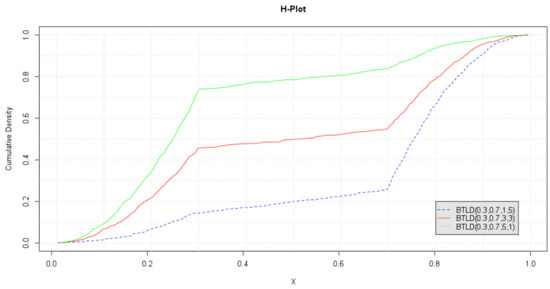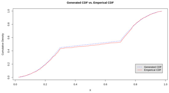 We continue with the simulated example to illustrate the goodness of fit tests for the BTL distribution. Given a simulated sample of size n from the TL distribution, the estimation of the parameters is fairly easy using the empirical estimate of which is shown in Figure 4. It is almost identical to the true df. Testing the fit of the model was conducted in R for simulated data from the bimodal triangular-linked distribution. The null hypothesis and alternative hypotheses for both cases are presented as follows:
