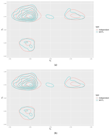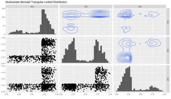 Copulas equip us with the mathematics to generalise the Bimodal triangular-linked distribution to the multivariate case and we use the theory above to derive the multivariate triangular-linked (MVTL), , distribution. Let be a random Gaussian copula, , with , by the probability integral transform, [46] being the marginals where [42], N is the sample size we are considering and d represents the dimensionality of the random variables. By the standard inverse transform [46], let where the marginals , for . Note that and . Therefore, let the distribution of be defined as follows