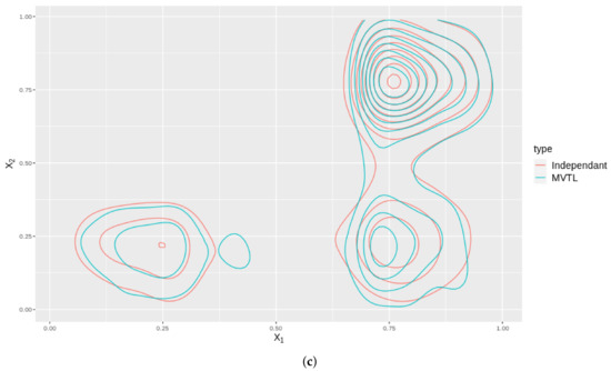 As an illustration, we plot the contours in 2D for two cases: one where we have a MVTL and the dependance structure is captured by a Gaussian copula, and; two, where the BTL marginals are independant. The distributions of these cases are plotted for all the variable , and shown in Figure 7. Note that these contours are not the same which means that by modelling the distribution using a copula, better captures any dependance structures inherent in the data.