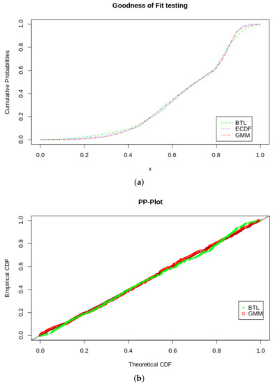 GOF tests. (a) ECDF, BTL CDF and GMM pseudo-CDF. (b) PP-plot of BTL and GMM.