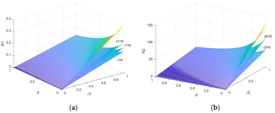 The relationship between basic reproductive numbers and other parameters are shown in Figure 1. The initial parameters are set as: , , , , , , and . As shown in Figure 1a, it can be observed that with the increase in d, the basic reproductive number decreases, and with the increase in , increases. When , , or , with the increase in , increases. Therefore, there is a linear relationship among , d, and .
