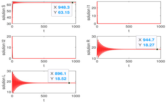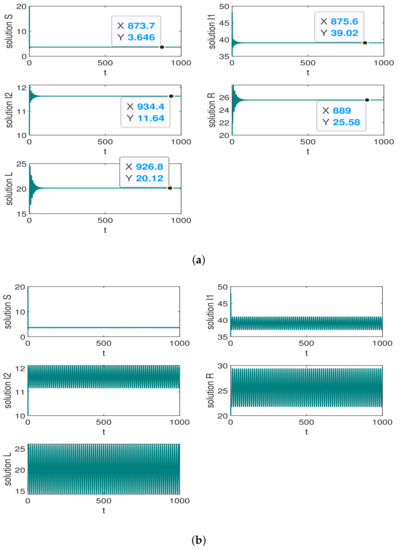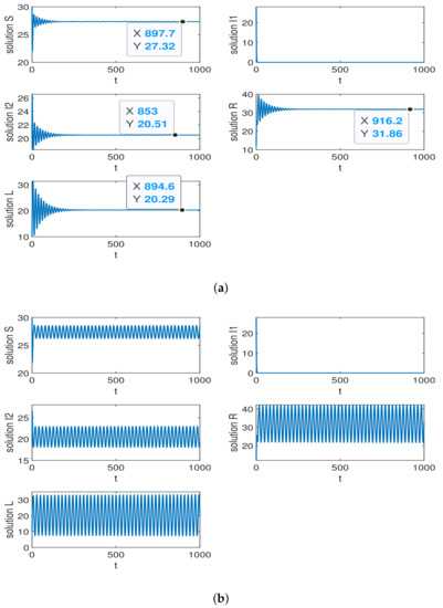Lastly, considering the endemic equilibrium, it is necessary to ensure and . The initial parameters are set as: , , , , , , , , , , and . The basic reproductive numbers can be obtained as . Thus, the endemic equilibrium is . The parameters are set to satisfy the Hopf condition, and the initial values of the nodes are set as . We can obtain and the critical value . As shown in Figure 5a, it is shown that the quantity of nodes of this system is from oscillation to stability when the charging delay . Thus, the system is locally asymptotically stable. From Figure 5b, if , the system will be unstable and goes into oscillation, and this diagram is a particular condition that the system is a periodic oscillation.
