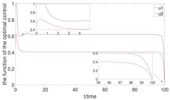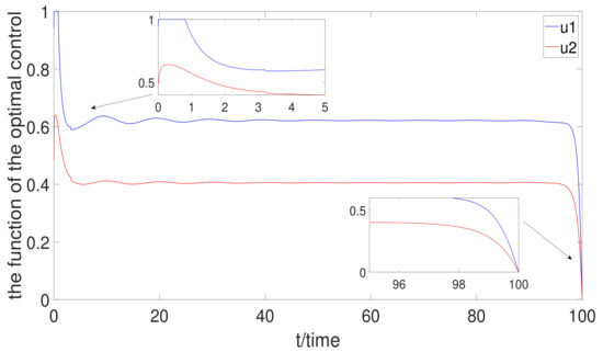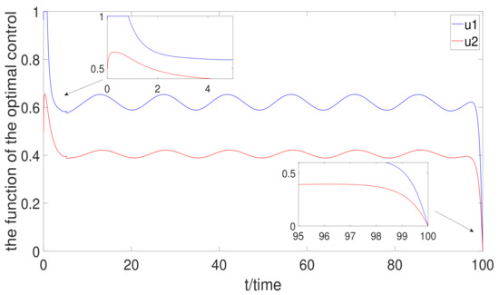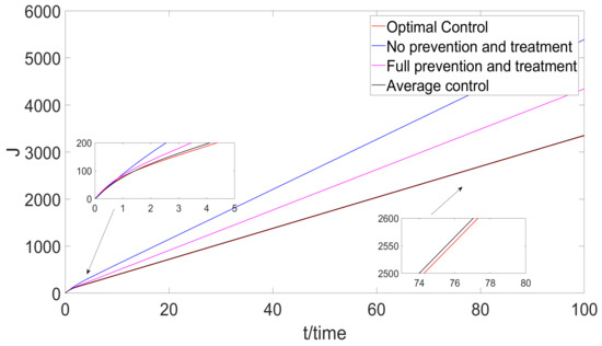 In summary, according to the above analysis, the full treatment has the best effect to control the numbers of and when the control strategy of the system does not consider the cost. However, optimal control has the best effect to control the numbers of and when the control strategy of the system considers the cost.