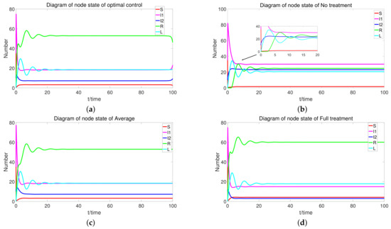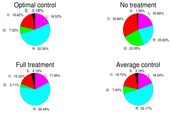 When , Figure 10 shows the ratio of different nodes for four control cases. For four cases, the proportion of S is the smallest and the proportion of R is the largest than the other state nodes of all the nodes. It is obvious that the ratios of and are lower for the full treatment than those for the no treatment. The ratio of decreases to , and decreases to . With the optimal control, the ratio of decreases to and decreases to . Then, the average control can also control the ratios of and .