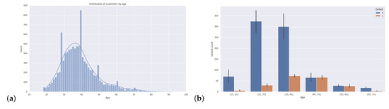 Figure 2a illustrates the age distribution of the clients: The bank clients in this dataset have a wide age range, from 18 to 92 years old with a standard deviation of 10.49 and a mean age of 39 years. However, the majority are between 30 and 40 years old (32 to 44 years old are in the 25th and 75th percentiles). The age distribution of the clients is fairly normal with moderate skewness and kurtosis values of 1.01 and 4.39, respectively. The Anderson-Darling statistic test is 142.19 which is well above each critical value for the corresponding significance level. For example, a significance level of = 0.01 with a critical value of 1.092 shows that the results are significant at the 0.01 level of significance. The same analysis can be done for the other numerical variables. Correlating the age distribution with the target variable, as shown in Figure 2b, reveals that the age groups with the highest attrition rates are 45–55 and 55–65, while the rate is very low for those under 35.