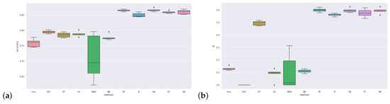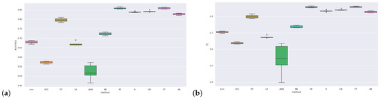 In the second experiment, we used the SMOTE method to balance the data between the two classes before using them to train the models. The SMOTE method has proved its effectiveness in several unbalanced class prediction problems. The cross-validated results, still in terms of accuracy and f1-score, are shown in Figure 7a,b, respectively. Once again the ensemble methods perform better overall than the individual methods. There is also near equality between the performances as measured by the accuracy and f1-score. This result shows that the minority class was predicted with the same chance as the majority class and more efficiently. RF and GB also keep the lead of the best performances.