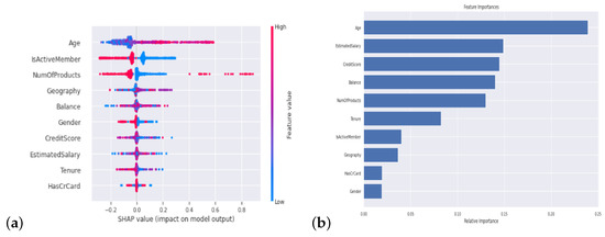 The biggest difference between this shap value with the regular feature importance plots is that it shows the positive and negative relationships of the predictors with the target variable. Shap summary plot in Figure 8a looks dotty because it is made of all the dots in the train data. Both rankings aim to identify which feature or set of features influenced the prediction in descending order. The joint analysis of these two figures allows us to highlight two perspectives on the impacts of the “age” and “HasCrCard” variables, which for the first is by far the most important while the second is the least of all. The “Balance” characteristic is also among the most important variables according to both rankings. These two perspectives more or less validate the hypothesis put forward in Section 4.2 by doing the exploratory analysis of our data with the correlation matrices. It is also important to note that all the variables contribute to decision-making.
