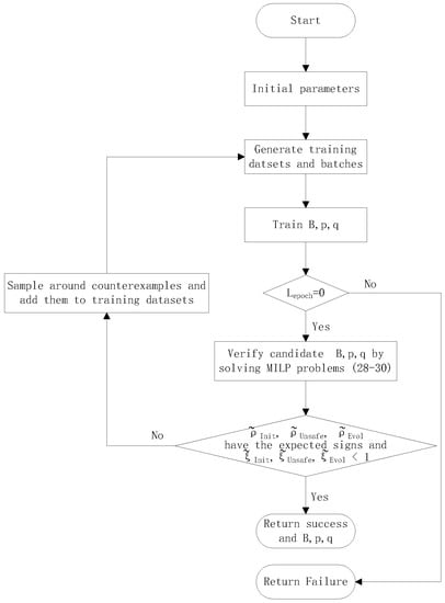 First, the respective weights among the layers and biases of neural networks B, p, and q are stochastically initialized with a standard Gaussian distribution. Then, the training datasets are generated (lines 1–2). In each epoch, with the loss function according to Equation (22) and the Adam [41] optimizer, the weights and biases of the networks are updated in a backpropagation. By minimizing L to zero, we find the candidates B, p, and q (lines 3–10). With the help of the optimization tool Gurobi, the verification of candidates B, p, and q can be transformed into the optimization problems in Equations (28)–(30). We find the current optimal solutions , , and the corresponding inputs , , respectively. If the current optimal solutions , , have the expected signs, and , , , then the candidates B, p, and q are globally consistent with the constraints in the conditions in Equations (23)–(25). Then, we return success and B, p, and q (Line 14). Otherwise, the sampling data points around the counterexamples are returned and added to the corresponding training datasets to refine the networks (lines 16–17). The training method based on Counterexample-Guided Inductive Synthesis (CEGIS) can train the neural network quickly and accurately. The candidates are trained and refined continuously until finding the real B, p, and q or reaching the maximum epoch number. Figure 2 is the flowchart of Algorithm 1.