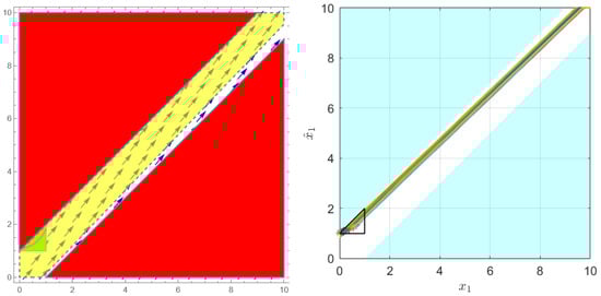 Suppose that state space , the initial set , the secret set , the non-secret set , and the control input set . For the augmented system , the initial set , , where is a relation function defined in Equation (10) and the unsafe set . We aim to verify the -approximate initial-state opacity property for the system, where captures the security guarantee level in terms of the measurement precision of the intruder.