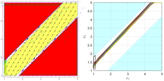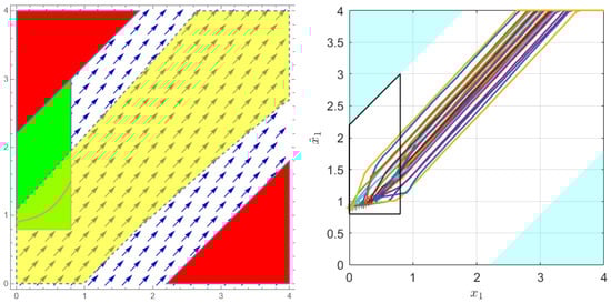 (Left) Phase portrait of Example 2 with . The pink line and the green, red, and yellow regions are the initial sets and , the unsafe set , and the sub-level set of , respectively. (Right) State runs of × on the projection of the plane starting from . The blue region represents the unsafe set .