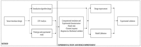 Broadly, the methodology consists of design, fabrication, experimental study and experimental validation stages. The design was an iterative process, thus in this paper only the final version which was improved according to the experimental results is shown. Figure 1 shows an overview of the research flow. In the design stage, sensor architecture and functions were established. The transduction algorithm correlates the theoretical pressure difference and ventilation curves shown in the display. A Computational Fluid Dynamics (CFD) analysis supports an exhaustive study of air airflow measurement in different flow conditions as well as with different orifice plate dimensions. A sensor prototype and equipment were specially designed for the experimental study. The experimental data obtained were used for the mathematical characterization of the sensor in dynamic [8], steady and real working conditions. Design improvement and model calibration were carried out based on the CFD simulation and experimental characterization [9].