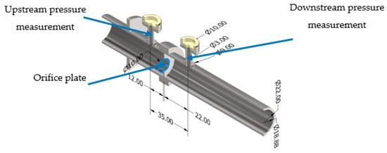 Figure 4 shows the compact air flow sensor developed for the integrated design, which is composed of an upstream and downstream pipe welded to an orifice plate. Dimensions are established based on the analytic and experimental results, which guarantee the pressure difference measurement over time for this particular medical application with a mechanical ventilation system OxygenIP.PE, whose nominal working conditions correspond to a transient flow [11].