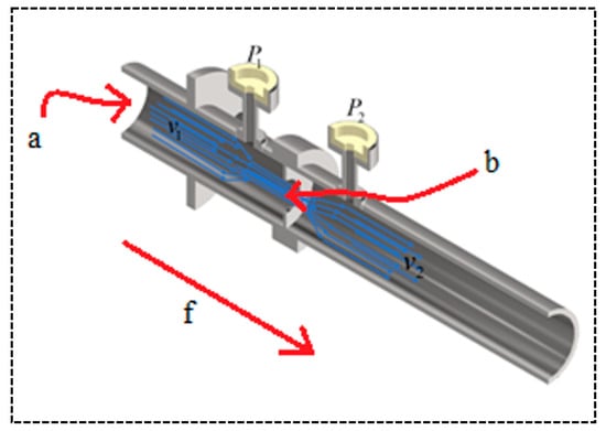 In Figure 5, a scheme to explain the theoretical model of the flow inside the airflow circuit is depicted. In which f is the air flow from a source, the section area of the hose is a, and the flow reduces its section area b while crossing the orifice plate. Thus, a pressure difference can be measured between points P1 and P2, moreover and represent the fluid flow speed of the air flow in the direction depicted by the red arrow [11,12].