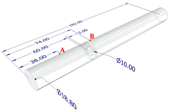 The geometry was modelled after the actual state bench design proposal (with an extended outlet to overcome reverse flow issues). Following Bridgeman’s steps [15], the sensor case was modelled as axisymmetric and the pressure sensing ports’ geometries were disregarded to save computational resources and time. Because of this, better and more structured meshes were obtained. Five geometries were generated in total (one for each orifice diameter). The meshes were then generated with an element size of 0.00025 m, all with good or excellent mesh metrics results, according to Ansys [16]. Figure 6 shows the model for the 10 mm orifice plate of the sensor case, in which A and B keep the distance for the static pressure orifices.