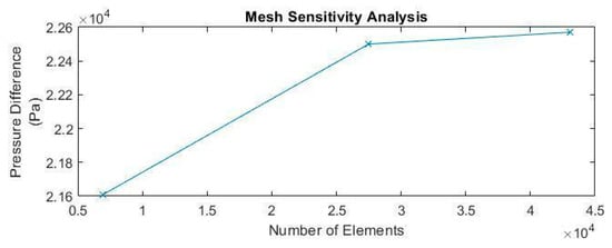 A mesh sensitivity analysis was performed for 3 different meshes. The first one contained 6962 elements; the second, 27,843; and the third, 43,045. The populations corresponded to meshes with element sizes of 0.0005 m, 0.00025 m, and 0.0002 m, respectively. These 3 different meshes were run as steady state cases for the 4 mm orifice and 100 L/min airflow. The results were then graphed.