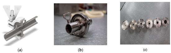 Figure 12 (by views of subfigures a–c) shows the variable orifice-plate flow sensor it is manufactured by two pipes joined together with a ferrule clamp to have a quick release mechanism. Downstream of the ferrule clamp, an orifice-plate is welded to the flange. In this study, 5 parts were fabricated with different diameters: 4, 6, 8, 10, 12 mm. Distances of the pressure taps to the orifice plate were established according to the design considerations of an orifice plate air flow sensor [3]. However, the distance of the downstream pressure tap was not able to be less than half radius because of welding limitations for the geometry.