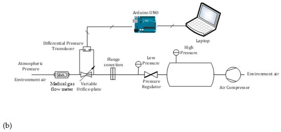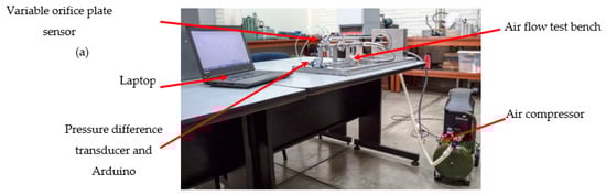 The variable orifice plate air flow sensor was tested for the air flow measurement in a steady state condition. Figure 13a shows the experimental setup designed for this test, where the variable orifice plate was installed in the air flow test bench, an air compressor providing the air flow through the variable orifice plate sensor was included, a pressure difference transducer based on microphones connected to an Arduino UNO microcontroller board was integrated and an algorithm was designed and programmed for this transduction stage. Figure 13b shows a schematic representation of the experimental setup and the interaction of its components.