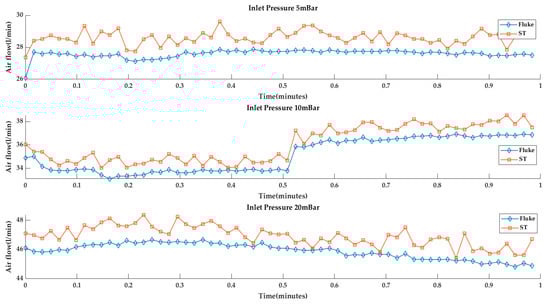 Indeed, the system formed by the sensor/transducer represented by “ST” receives a mechanical signal “Ms1” (fluid mechanical signal for this case, which is pressure difference) and transforms it into the electrical equivalent “Es” or a response signal “Ms2” (fluid mechanics variable as volume or airflow equivalent signal). This conversion (transduction) requires characterization and calibration steps, which are depicted by the scheme summarized in Figure 10. From the static measurement data analysis, is possible to recognize the linear and nonlinear operations in the ST system. This information is quite important according to the design of the algorithm, which provides the final information of the ST measurement, such as the breathing variables of pressure, volume, and airflow.