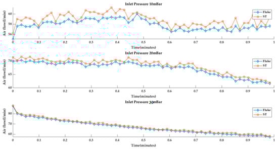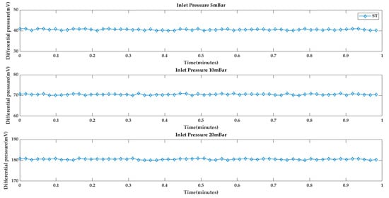 For a given flow, the smaller the orifice diameter, the larger the pressure difference induced in the orifice plate. This could happen because, for a given flow, a smaller orifice diameter requires the flow to pass through the opening. This increases the flow velocity, but at the cost of reducing the flow pressure at the outlet, resulting in greater pressure differences in the orifice plate. Therefore, a bigger inlet pressure would be necessary to help the flow overcome the pressure loss in the pipes. It can also be concluded that a plate with a smaller orifice diameter would be the best for this sensor. Taking this into account, lower pressure drops would occur in the plate, which would not considerably affect the flow, while at the same time being large enough to be detected by the ST and still being in the measuring range.
