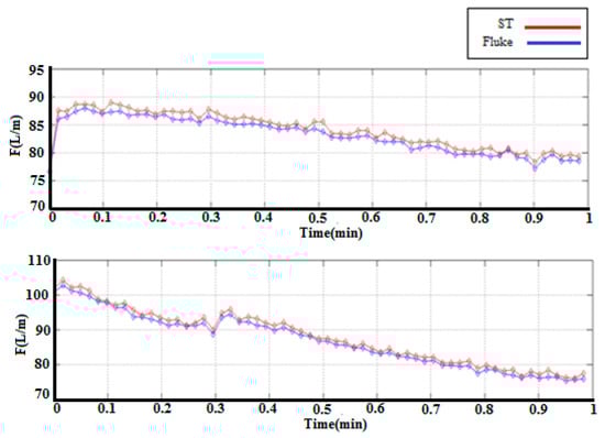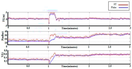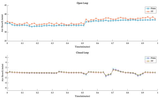The variable orifice plate of the air flow sensor was installed in a breathing circuit connected to a mechanical ventilation system based on cams “OxygenIP.PE” [1]. This experiment corresponded to the real working conditions of the air flow sensor/transducer which was designed. A medical gas flow meter Fluke VT650 was connected to the circuit to obtain the real air flow over time, which is showed by the Figure 14a.