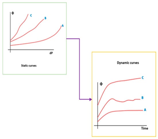 By conducting a static pressure analysis, it is possible to obtain Equation (3), where is the volumetric flow rate [13], and are the cross sections area, and the initial and the final static pressure are and , which are proportionate to the difference of pressure .