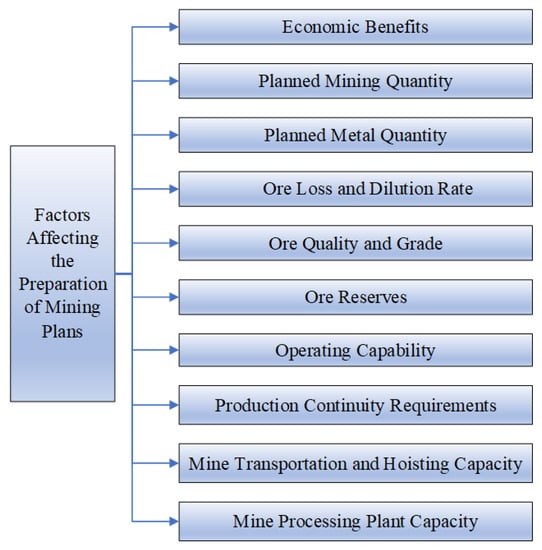 There are many factors that need to be considered comprehensively in the preparation of an underground mine extraction plan, and by analyzing the current situation faced by underground mining and the existing mining technology conditions [25,26,27,28,29,30], the main factors that need to be considered in the process of extraction plan preparation are shown in Figure 1.