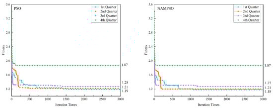 where denotes the maximum number of iterations; denotes the current number of iterations; and denote the set maximum inertia weights and minimum inertia weights, respectively. Through several experimental analyses, the authors found that as the number of iterations increases, when , the search performance of the algorithm is greatly improved [38,39].