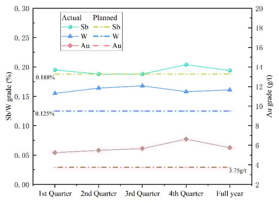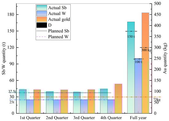 - As shown in Figure 5, in terms of the production of gold, antimony, and tungsten, the actual production for each quarter and year in the extraction plan given in this paper is slightly higher or equal to the planned production, which fully meets the annual metal production target set by the enterprise. The percentages of gold production in each quarter are 24%, 23%, 24%, and 29%, respectively; the percentages of antimony production in each quarter are 26%, 24%, 23%, and 27%, respectively; and the percentages of tungsten production in each quarter are 25%, 25%, 25%, and 25%, respectively. From the absolute uniform distribution of tungsten production in each quarter, it can be seen that the algorithm takes the achievement of tungsten production as one of the key conditions when searching for the optimal mining plan, which fully meets the metal content constraint requirement of the model, and because the grade of tungsten is relatively the lowest among the three metals in the ore of each mining site, the value of tungsten is relatively the lowest among the three metals, and the recovery rate of tungsten beneficiation is also the lowest.