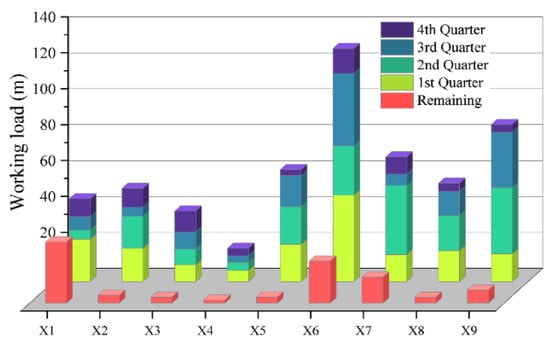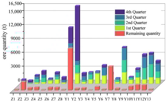 - As shown in Figure 8, in terms of mining balance, in order to seek the quarterly quantity of ore production that satisfies each constraint, the quantity of ore mined from each mineral deposit (including the mine room and pillar) varies each quarter, which reflects the equilibrium process of ore matching. Through four quarters of mining, the ore reserves of each mining field are basically depleted, and in actual production the ore reserves of the mining field can be considered as the end of mining when they are below a certain value. After one year of mining, most of the 21 recovery mining fields involved in the plan can be considered as completed. In order to ensure that mine production can be carried out continuously, it is necessary to adhere to the principle of balanced mining and excavation with excavation first. In this paper, the mining plan is formulated mainly through the balance between the recovery quantity and mining preparation quantity to ensure the continuity of production, as shown in Figure 9. This paper contains nine mining preparation fields, each of which has a different footage of excavation in each quarter, and the reason for this is that the quantity of ore production from each mining preparation project also must meet the production constraints. After four quarters of mining preparation work, the nine mining preparation fields are basically finished and can be used as back mining fields for the next year, which can ensure the continuous progress of production work in the next year.
