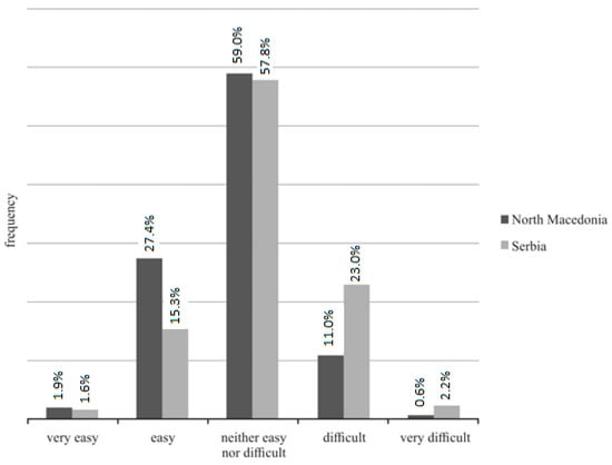 As shown in Figure 2, most of the students of both countries characterized the questions as neither easy nor difficult. Differences have emerged within the categories easy and difficult. A higher percentage of Serbian students than North Macedonian ones assessed the same questions as difficult. It means that Serbian students had to occupy working memory capacity more by invoking information from the long-term and short-term memory to solve the task successfully. Therefore, they had to make more effort to solve the questions than North Macedonian students. It can be assumed that the reasons are in the difference in teaching hours and more practice for North Macedonian students. By devoting more time to the graphs’ analysis and discussion, students better understand the causal relationships, and the teaching material was more accessible for them because they are used to working with graphs.