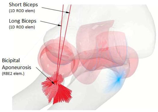 The FEA model was implemented in Siemens FEMAP 10.2 as preprocessor and postprocessor, and NX Nastran 7.1, as solver. FEA software was described in detail in previous research []. Figure 3 shows the two developed FEA models for the biceps and triceps FEM analysis.