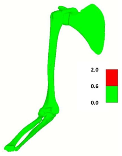 - Tendon insertion in bone. It has been modeled by adding a rigid element (RBE2), joining the end node of the 1D MTU element with several nodes in the bone, and thus distributing the reaction force in the area of the insertion of the tendons, as explained in previous research []. Of the restrictions that an element with these characteristics can apply, only the displacements in the X, Y or Z axes have been applied, freeing the turns around them. In this way, and since the MTU only transmits axial forces, we eliminate any possible bending moments that may affect the insertion of the tendon in the bone.