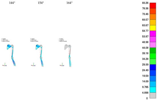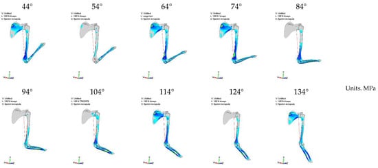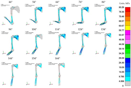 Different Elbow Angle Configuration: Bone Von Mises Stress Distribution Biceps Loading Case (150 N on wrist).