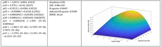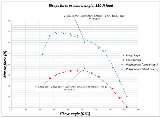 For example, to calculate the estimated force that must appear in each of the joint muscles to support a load applied to the wrist of 235 N with the elbow forming an angle of 119 degrees, we need to substitute the values of α and in Equation (12), depending on which muscle we want to analyze.